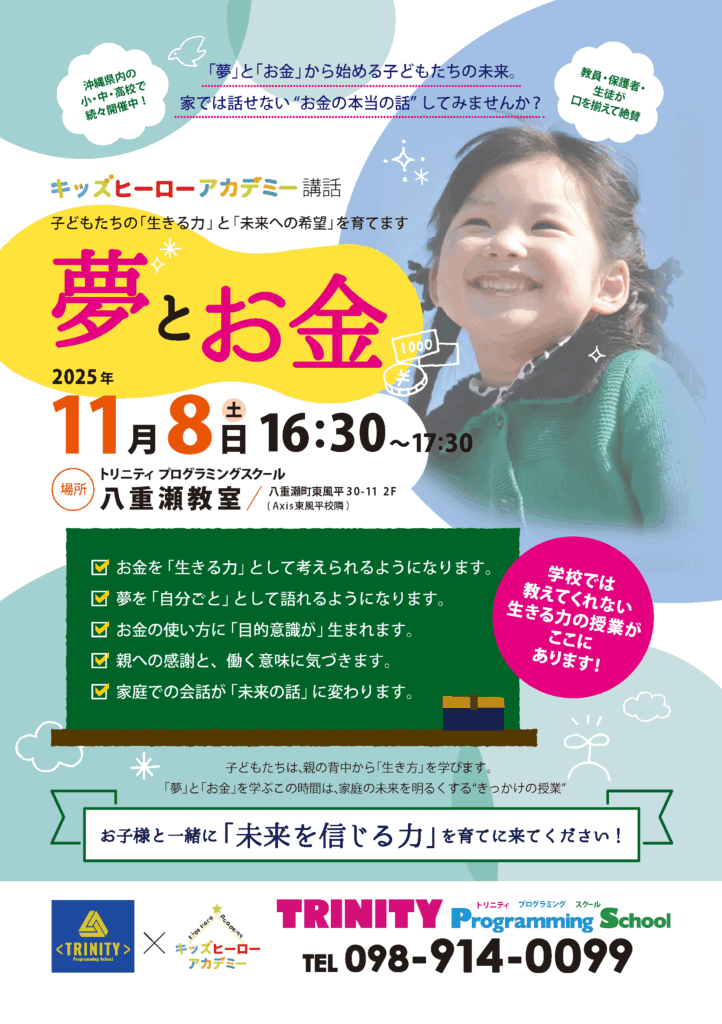 プログラミング教室トリニティとのコラボ企画By キッズヒーローアカデミー / 2025年10月23日 11/8八重瀬教室と11/22新都心教室でトリニティで実施いたします。「夢とお金」をテーマに講話をさせていただきます。本件に関するお問い合わせは、チラシの連絡先までお願いいたします。お問い合わせの際は、キッズヒーローアカデミーのホームページを見たと仰っていただくと話がスムーズです。